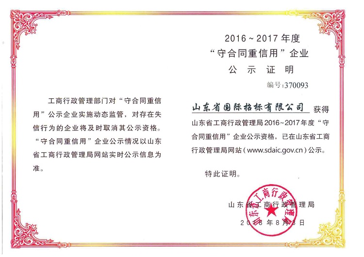 山東省國際招標(biāo)有限公司被認(rèn)定為2016~2017年度山東省“守合同重信用”企業(yè)。
