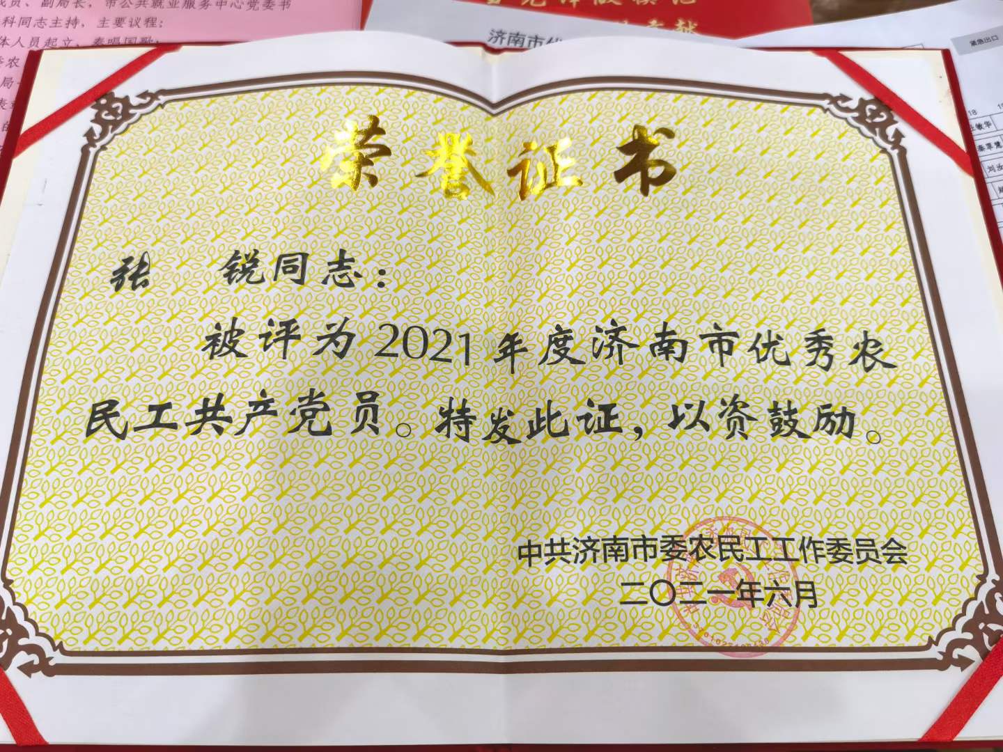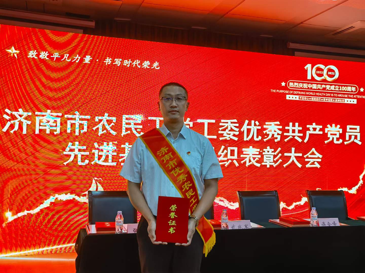 6月28日召開了濟南市農民工黨工委優(yōu)秀共產黨員、先進基層黨組織表彰大會,會上我公司黨支部書記張銳同志被評為2021年度濟南市優(yōu)秀農民工共產黨員。